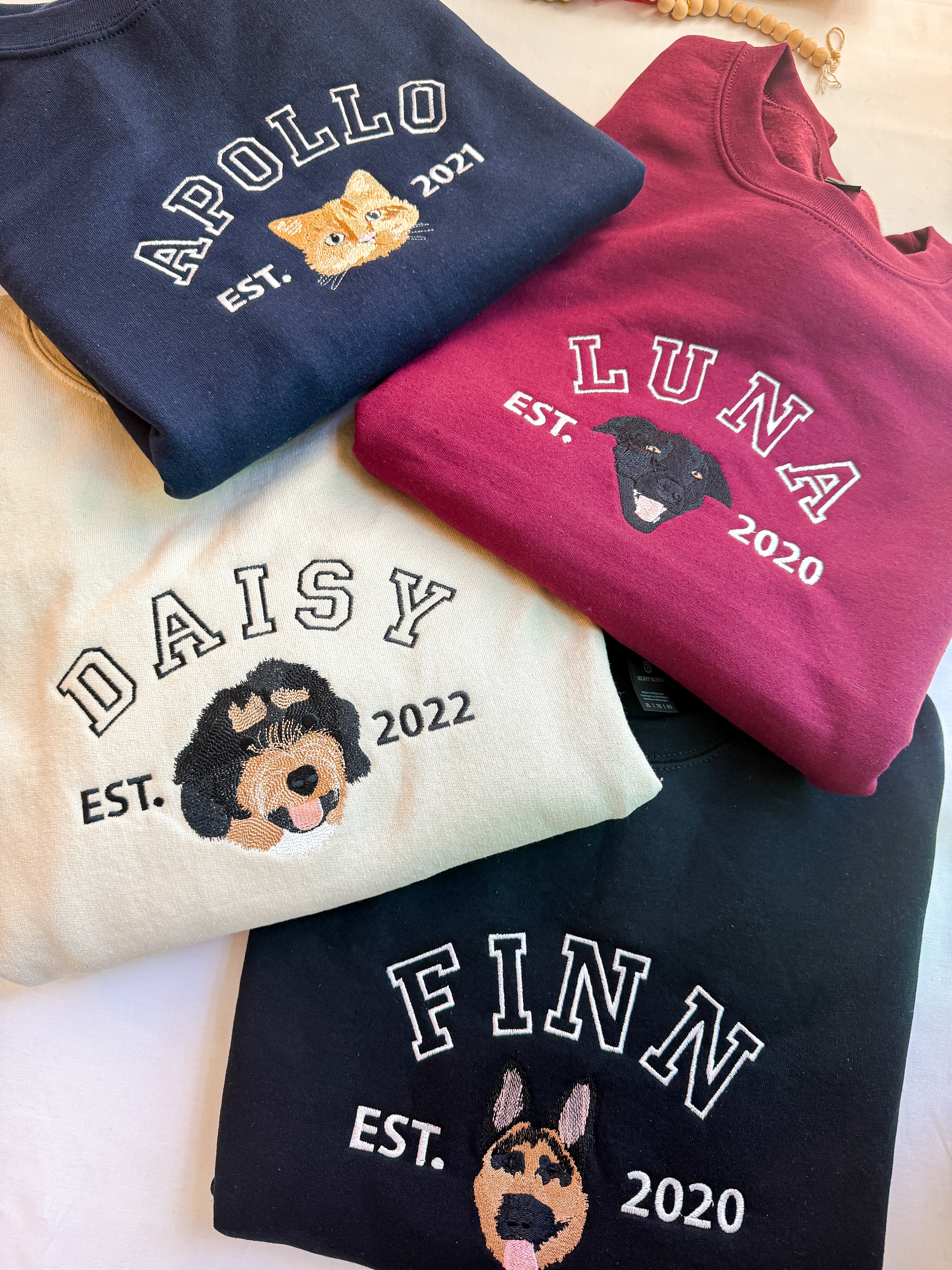 Upload your pet’s photo—we’ll hand-draw and stitch their sweet face into a one-of-a-kind embroidered masterpiece.