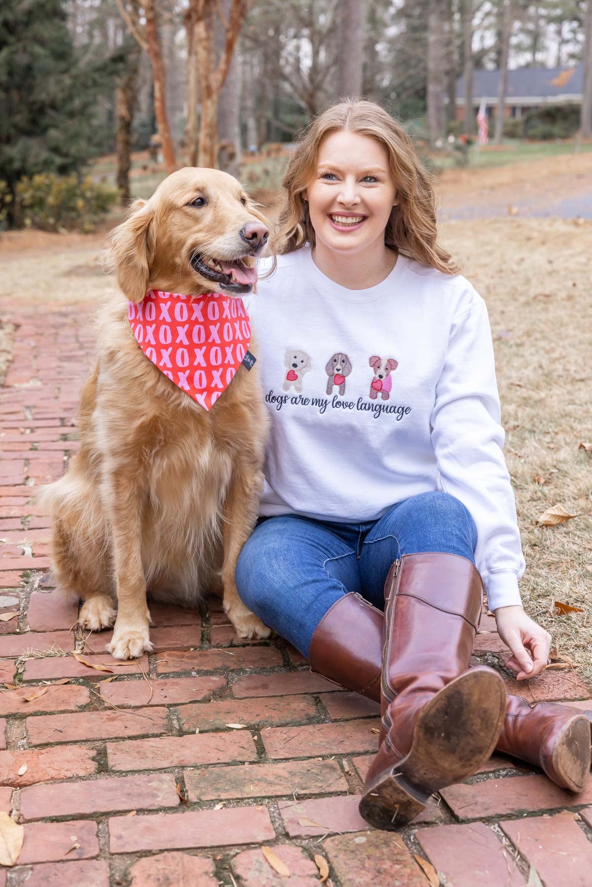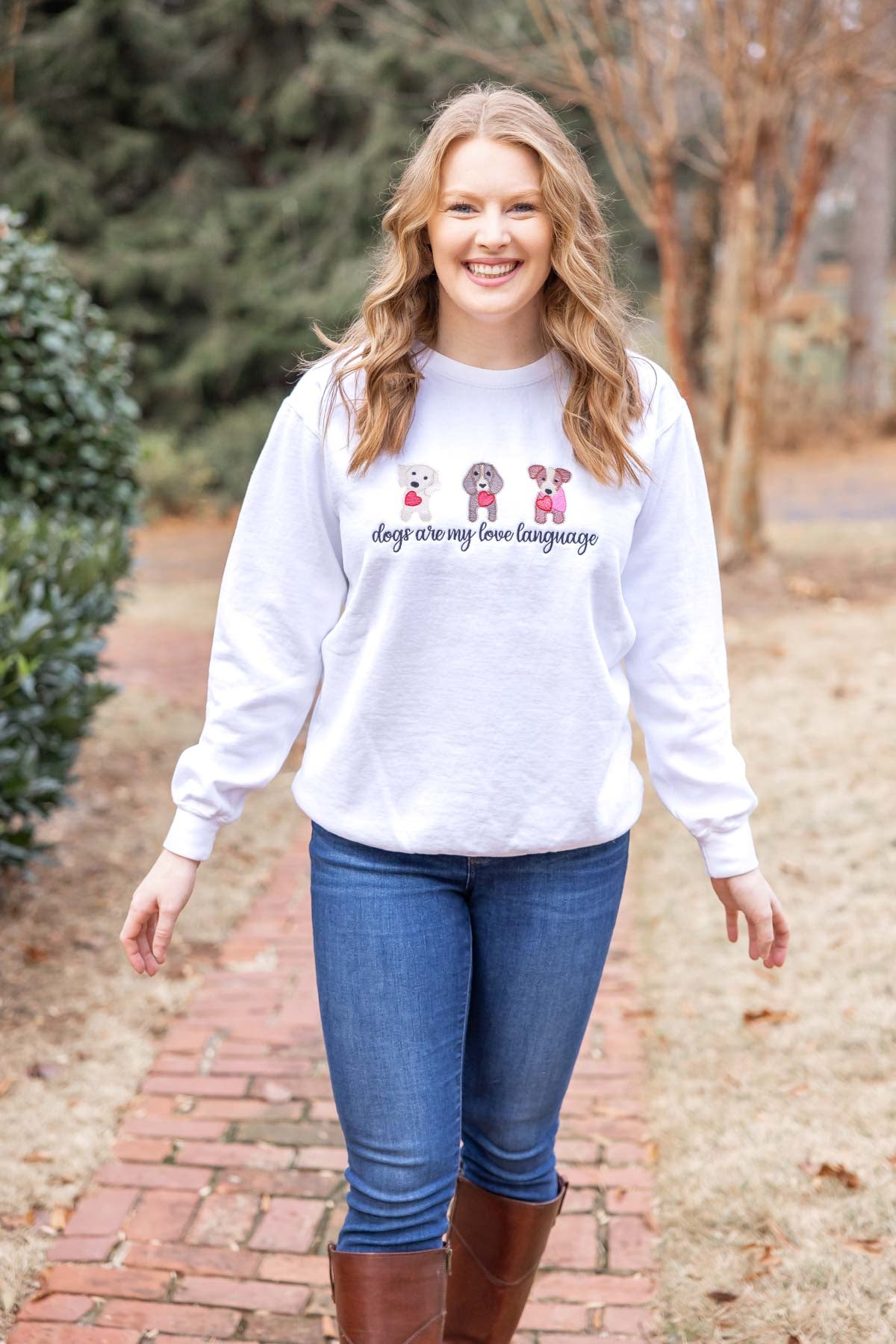 The perfect Valentine's Day sweatshirt for every dog lover out there. This adorable embroidered sweatshirt is a white Comfort Colors crew neck. The design features three pups holding hearts with 'Dog's are my love language' in cursive.