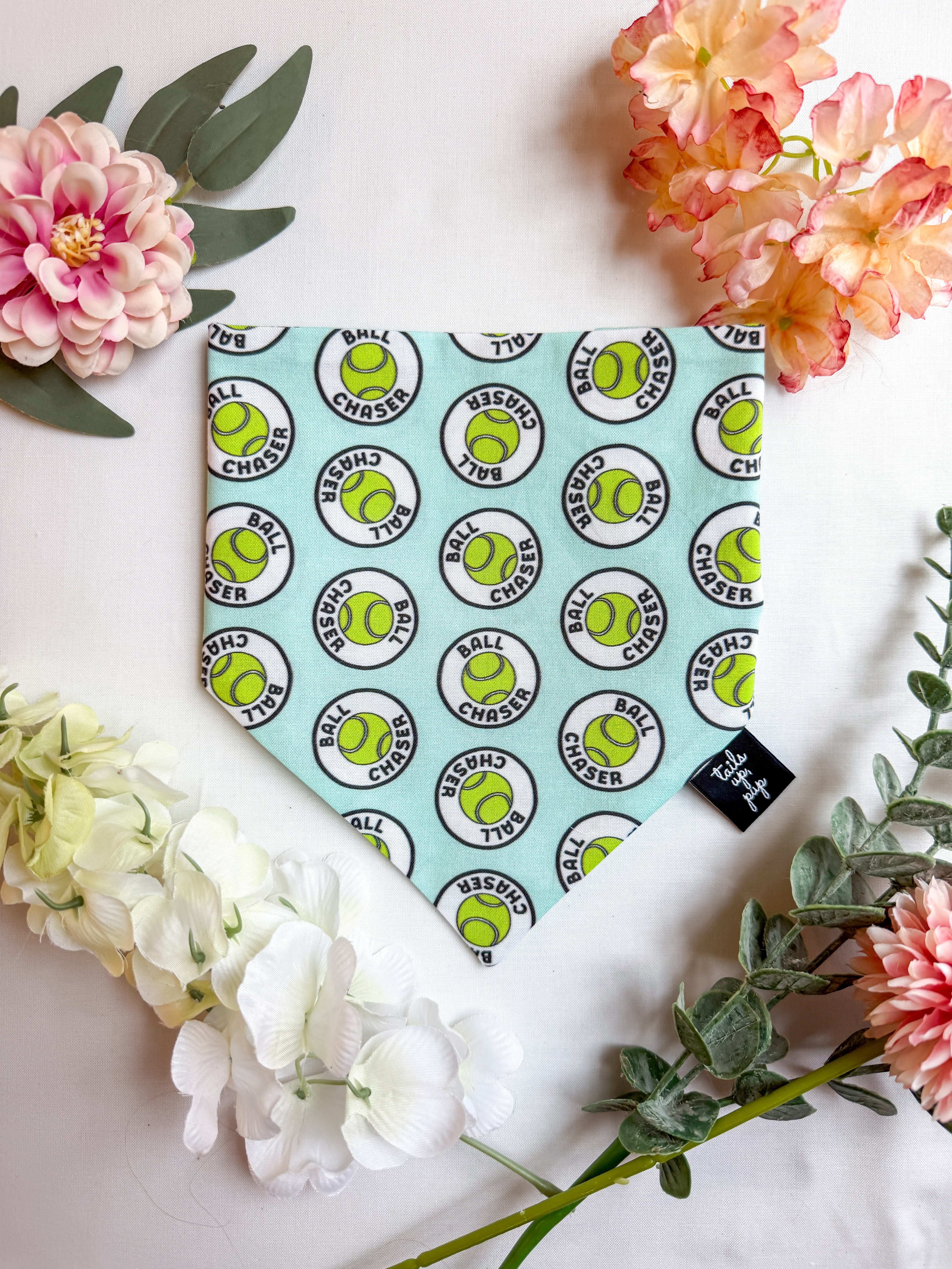 Made for the fetch-obsessed, this playful bandana celebrates your pup’s favorite hobby. With bold tennis ball graphics and the phrase “Ball Chaser” printed all over, it’s the perfect look for dogs who never say no to a game of catch. The bright colors pop against a sky blue background, making it a fun statement for park days and backyard sprints.