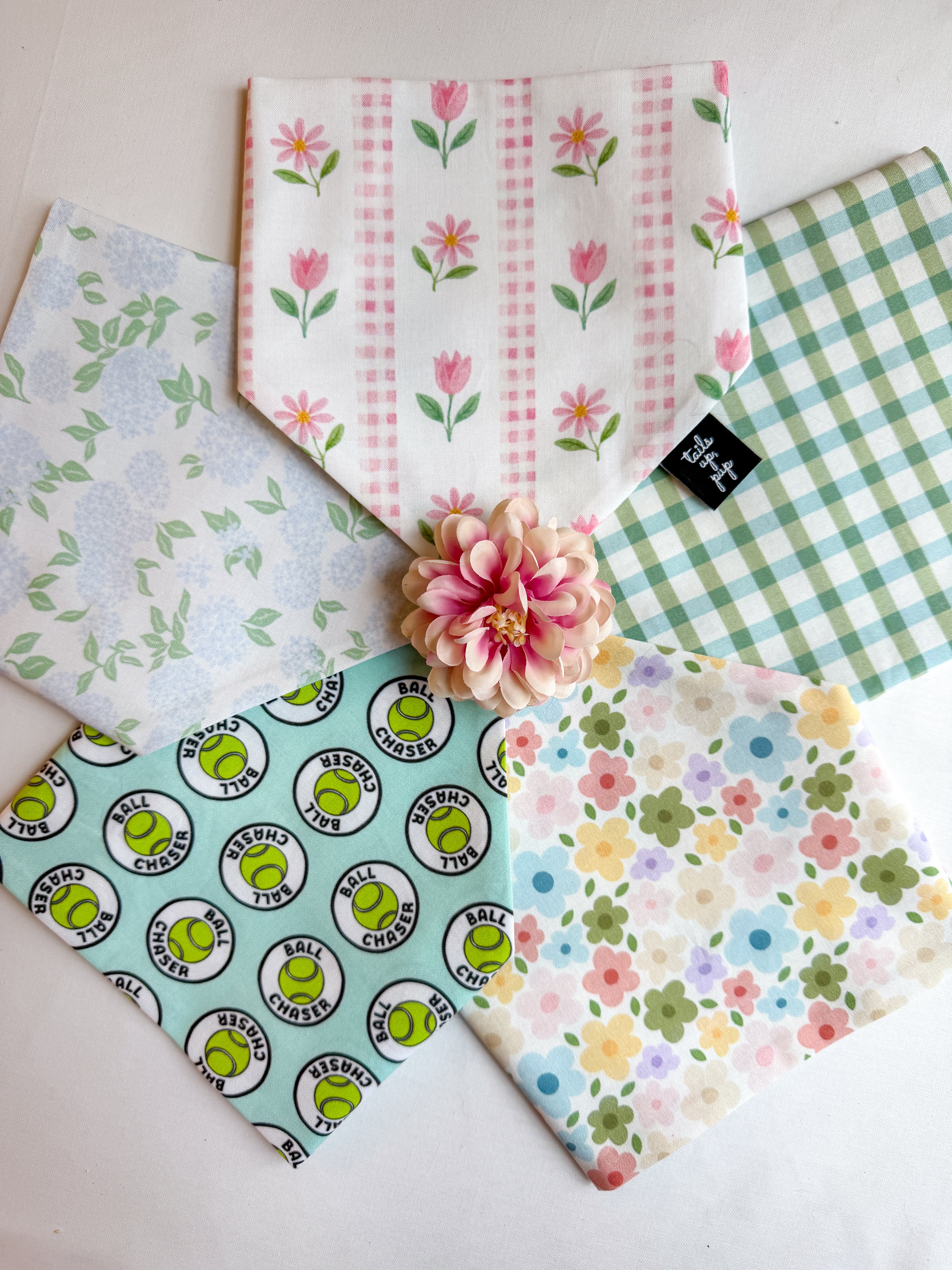 Tie-on bandanas have a patterned front side and a coordinating solid-colored back side and should be tied loosely around your pup's neck. The bandana is not too tight if you can place two fingers between the bandana and your dog's neck and easily slide them back and forth.