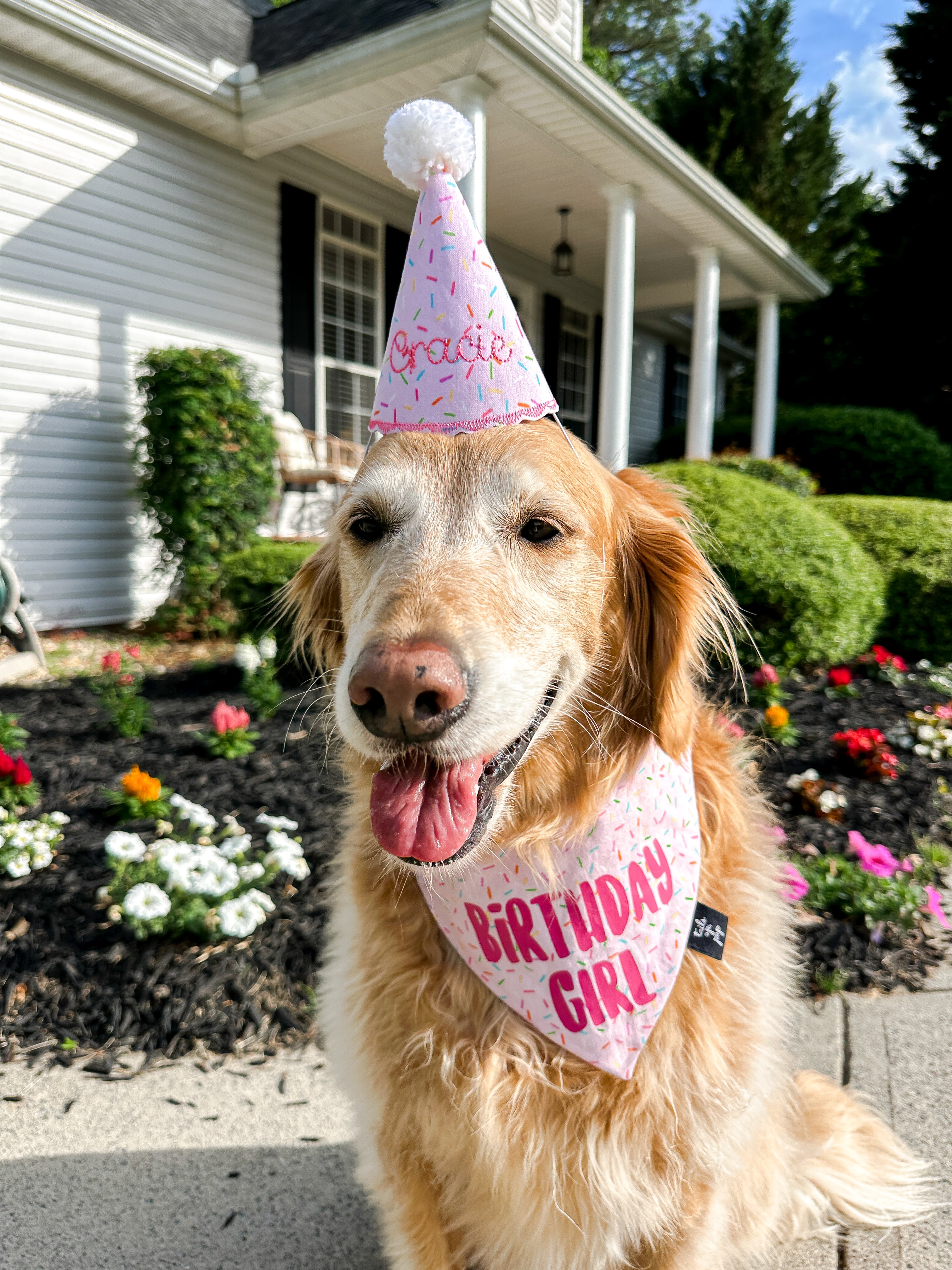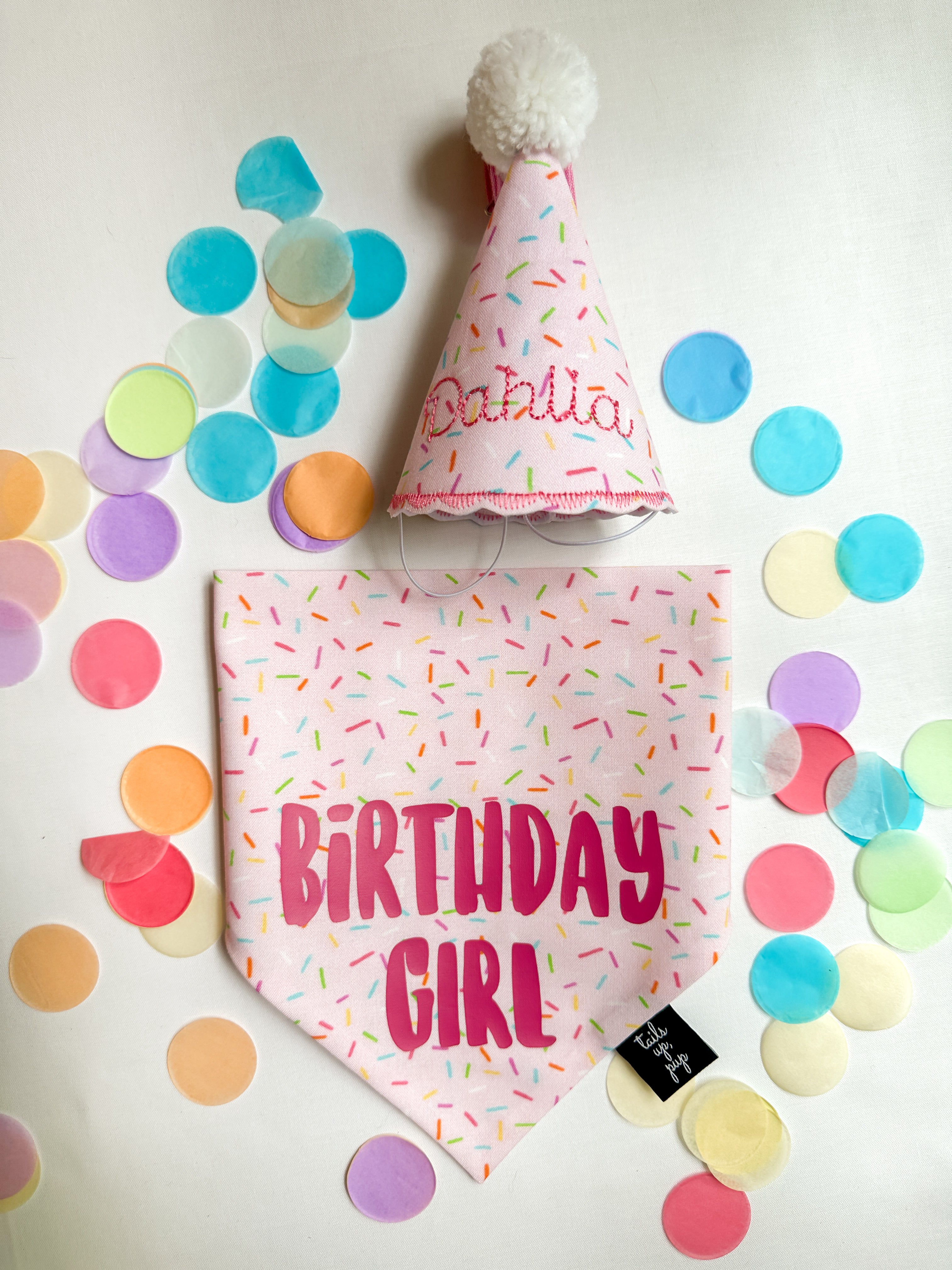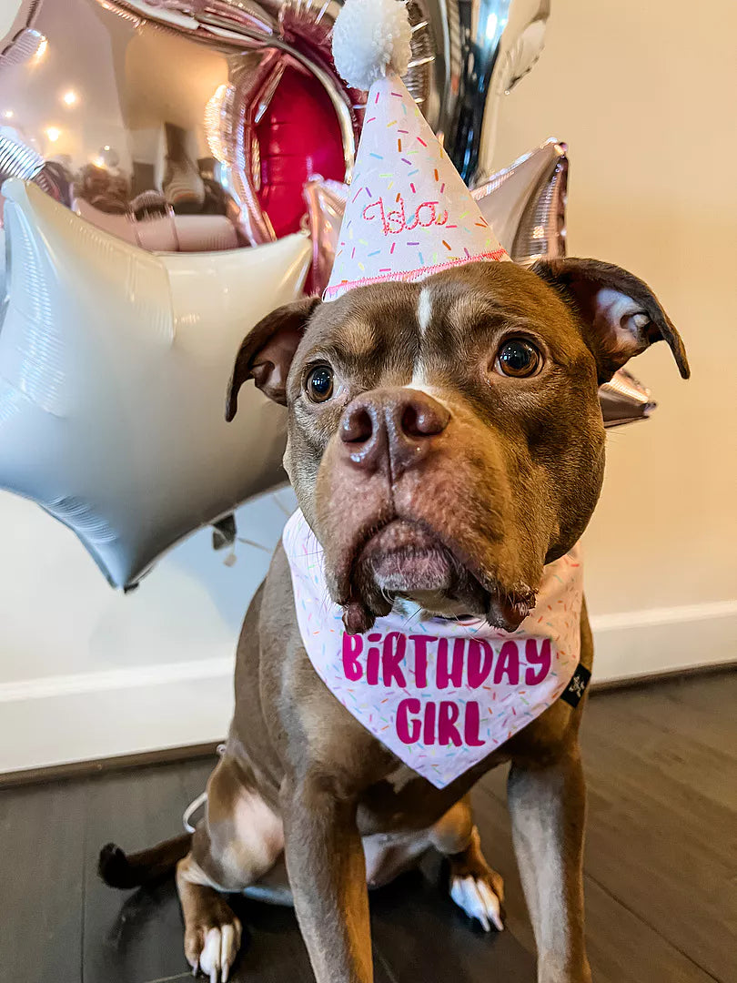 Make her birthday extra sweet with our sprinkle-tastic Birthday Girl Bandana & Hat Bundle... the ultimate party-ready look for your favorite fur queen! This handmade set features a pink sprinkle pattern that screams celebration, complete with a bold “BIRTHDAY GIRL” design on the bandana and a matching embroidered party hat topped with a fluffy pom-pom. And yes – the hat is personalized with her name for that extra special touch. 💕