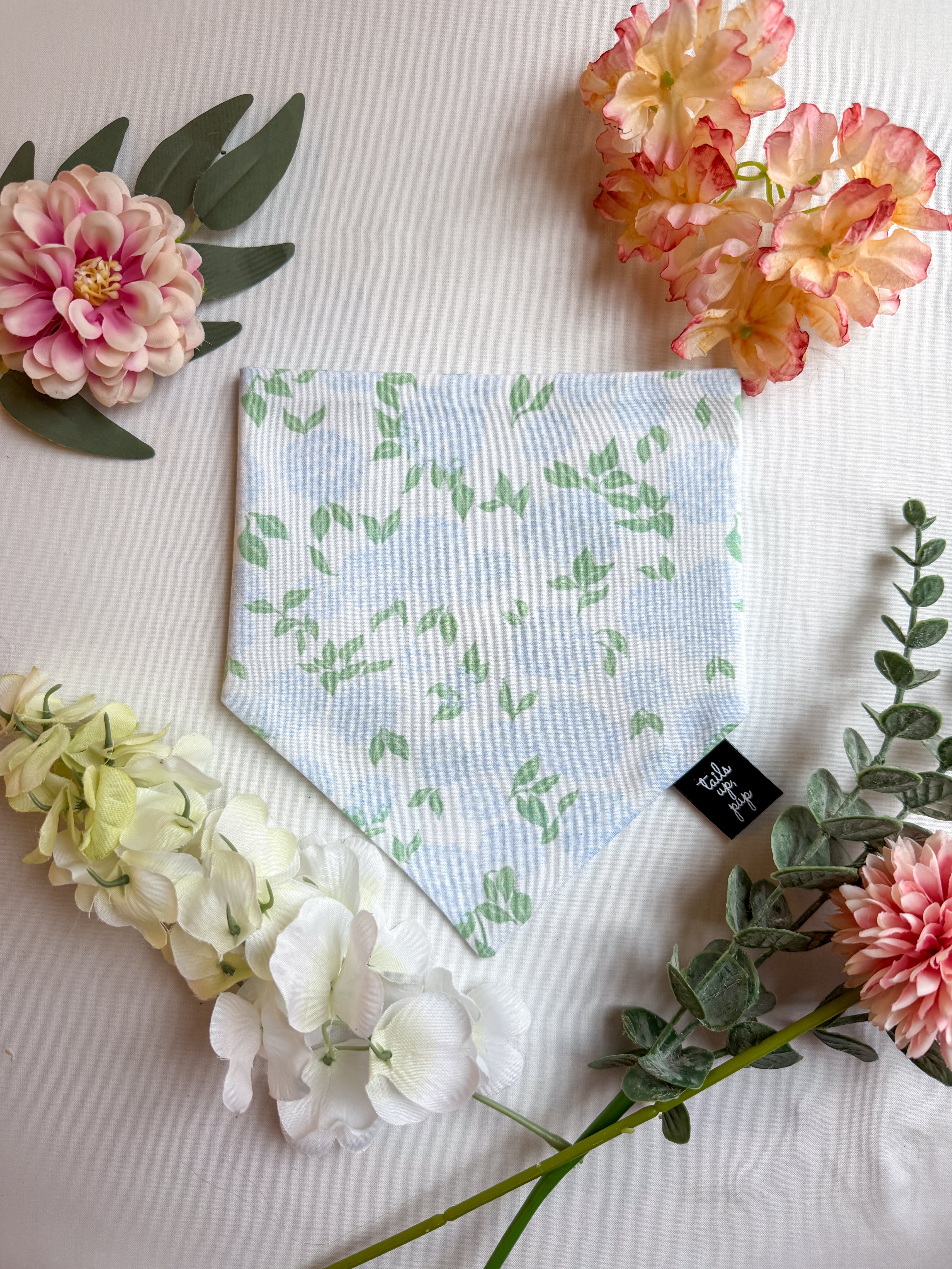 Add a touch of spring to your pup’s wardrobe with our Blue Hydrangea Bloom bandana – a soft and dreamy floral print perfect for garden strolls and sunny days. Handmade with love, this lightweight bandana features delicate pastel blue blooms and leafy greens that pop against a creamy white background. Personalize it with your dog’s name for an extra special detail that’s as unique as your pup!