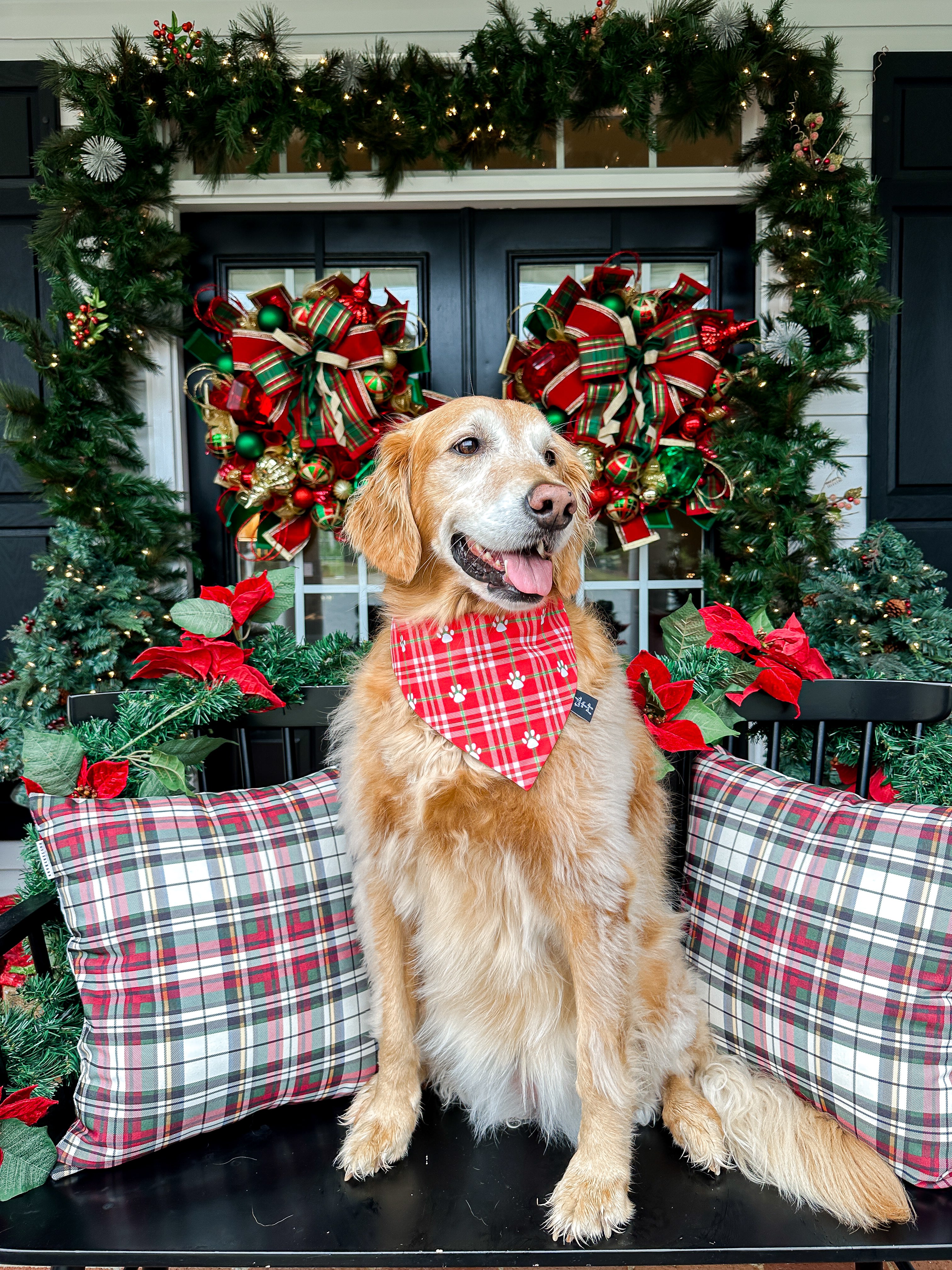Gracie is a 70-pound Golden Retriever and is wearing a size medium slip-on bandana
