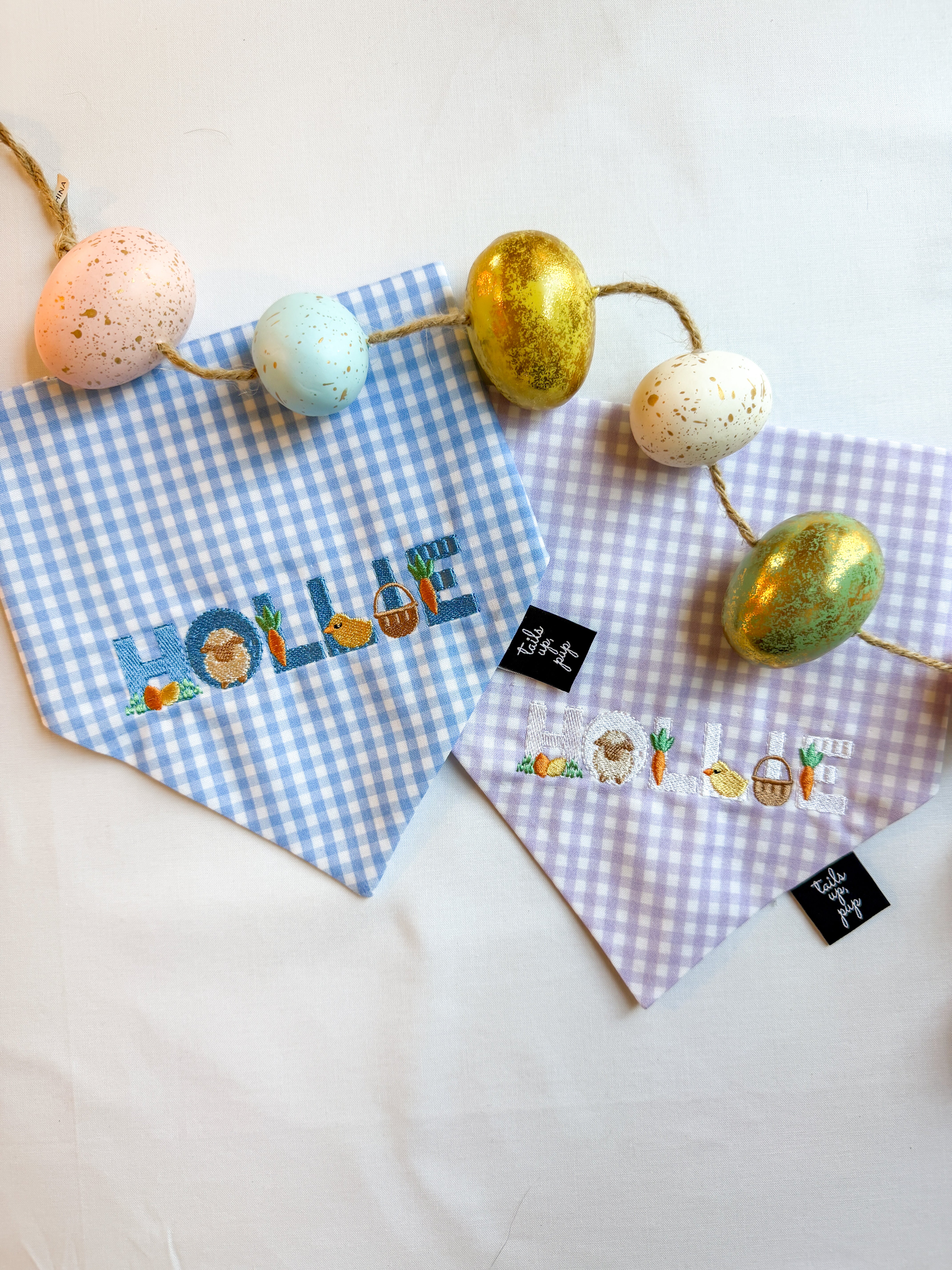 Tie-on bandanas have a patterned front side and a coordinating solid-colored back side and should be tied loosely around your pup's neck. The bandana is not too tight if you can place two fingers between the bandana and your dog's neck and easily slide them back and forth.